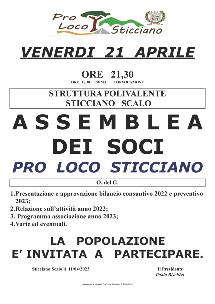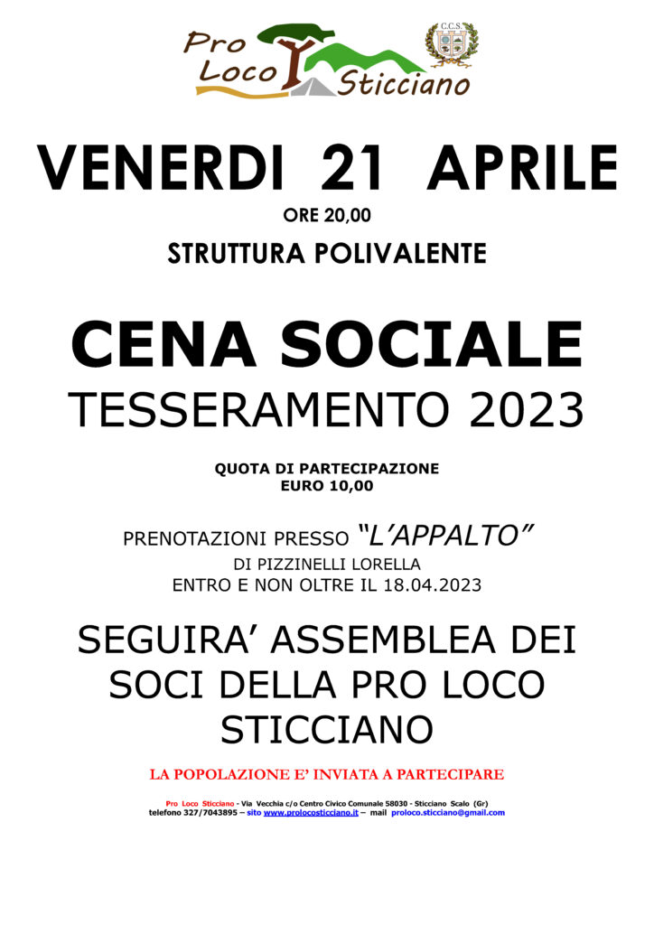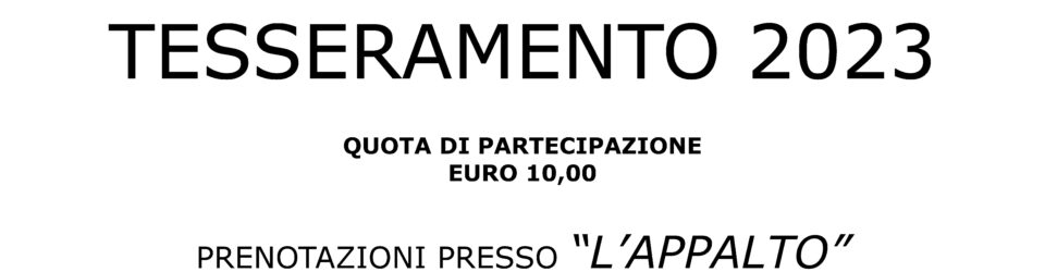 👉 Venerdì 21 Aprile ore 20 Cena sociale con Tesseramento 2023 presso la Struttura Polivalente e a seguire Assemblea dei Soci. Maggiori dettagli:MANIFESTO CENA SOCIALE 2023avviso pubblico assemblea 2023