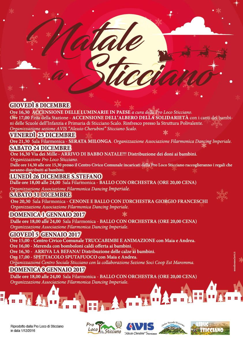 8 dicembre Accensione luminarie; 24 dicembre Babbo Natale; 29 dicembre Pizzaioli infarinati.