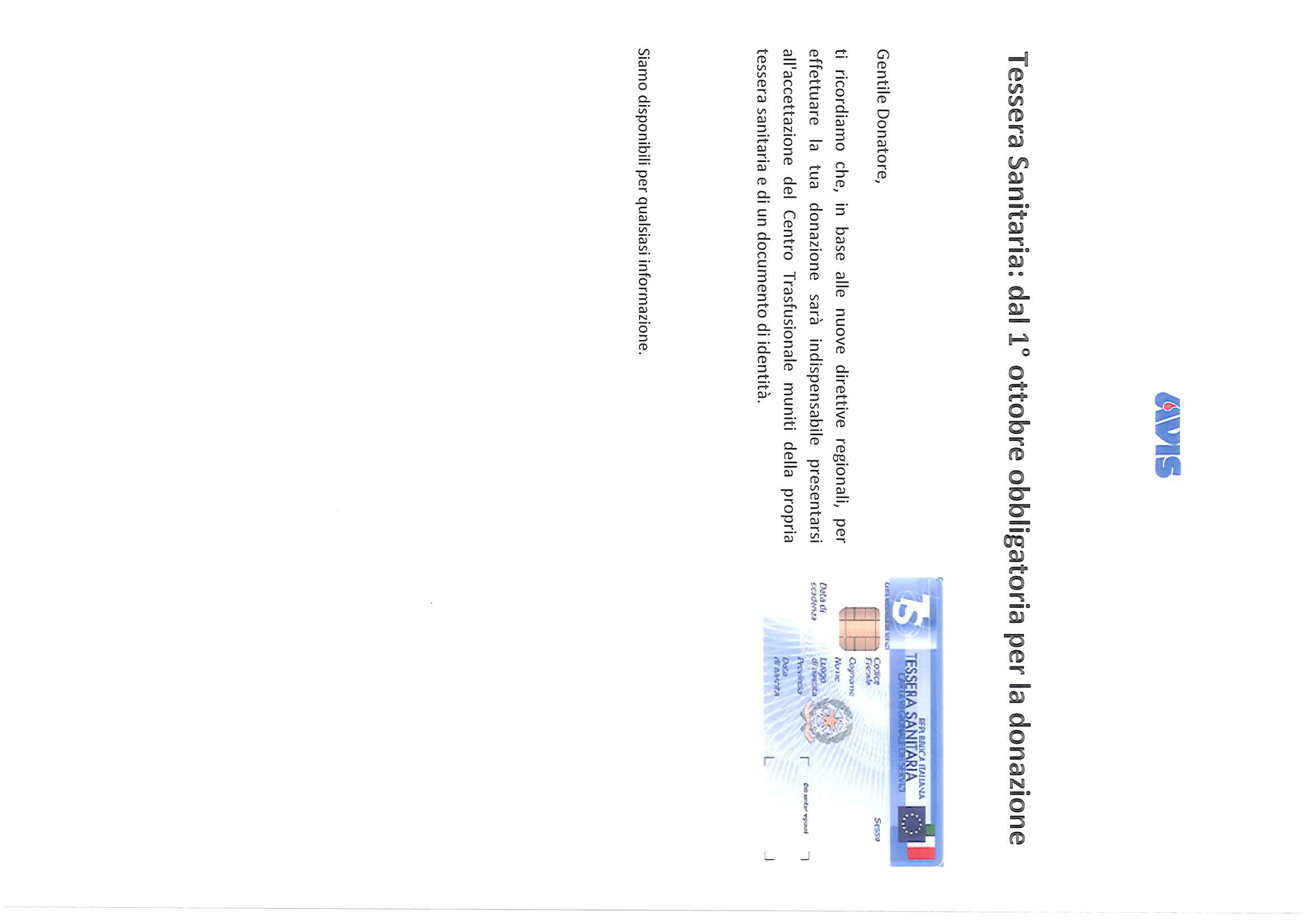 Dal 1° di Ottobre per andare a donare è obbligatorio esibire la tessera sanitaria ed il doc. di identità.Avis Informazione ai Donatori