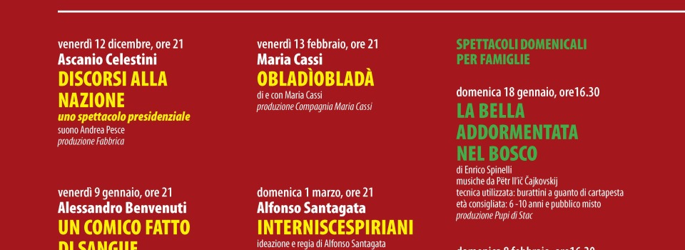 Il 12 dicembre, con Discorsi alla Nazione uno spettacolo presidenziale di Ascanio Celestini, parte alla grande il cartellone 2014/2015 del Teatro comunale dei Concordi di Roccastrada. 6 spettacoli in serale che portano sul palcoscenico del Concordi alcuni tra i nomi più conosciuti agli amanti del teatro, e non solo, e graditi ritorni di “vecchi amici”, cui si […]