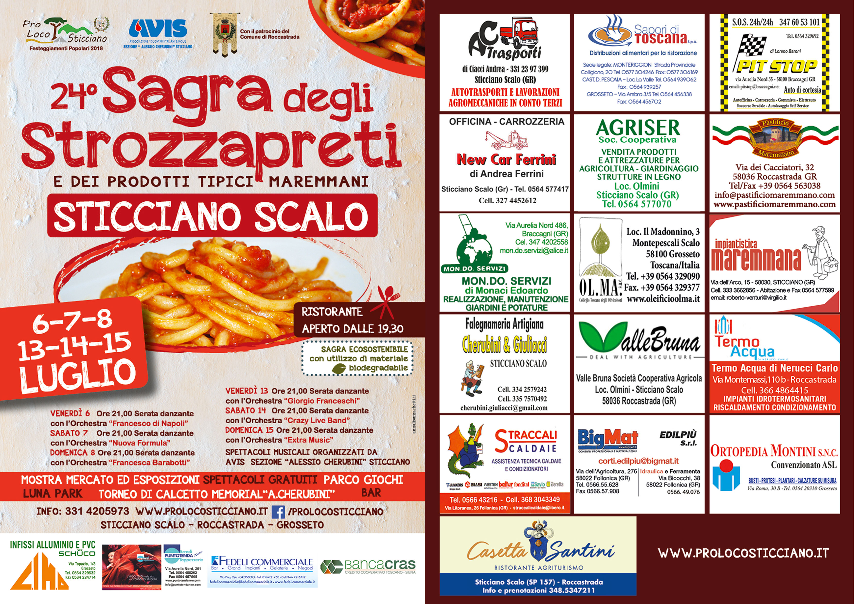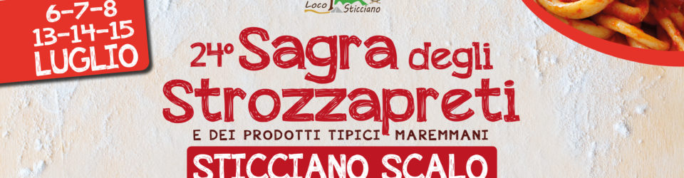 Nei giorni 6 – 7 – 8 e 13 – 14 – 15 luglio 2018 torna la Sagra degli Strozzapreti e dei prodotti tipici maremmani a Sticciano Scalo – Roccastrada (GR). L’evento, giunto alla 24°edizione, è organizzato dalla Pro Loco di Sticciano e si terrà presso la nuova struttura polivalente, dove sarà possibile gustare prodotti tipicamente maremmani ed in particolare gli strozzapreti, a cui la sagra è dedicata. Si tratta di un tipo di pasta della tradizione della Maremma Grossetana, realizzata con ingredienti semplicissimi come acqua e farina e conditi con sughi realizzati dalle sapienti mani delle cuoche di Sticciano.
