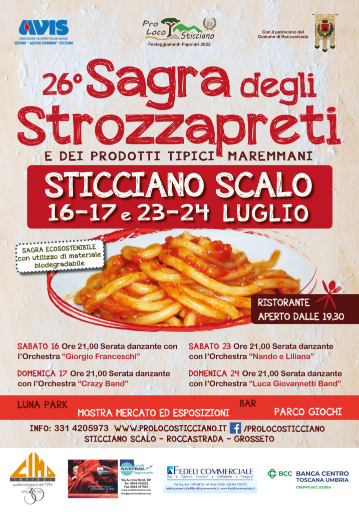 Nei giorni 16-17 e 23-24 luglio 2022 torna la Sagra degli Strozzapreti e dei prodotti tipici maremmani a Sticciano Scalo – Roccastrada (GR). L’evento, giunto alla 26°edizione, è organizzato dalla Pro Loco di Sticciano e si terrà presso la nuova struttura polivalente, dove sarà possibile gustare prodotti tipicamente maremmani ed in particolare gli strozzapreti, a cui la sagra è dedicata. Si tratta di un tipo di pasta della tradizione della Maremma Grossetana, realizzata con ingredienti semplicissimi come acqua e farina e conditi con sughi realizzati dalle sapienti mani delle cuoche di Sticciano.