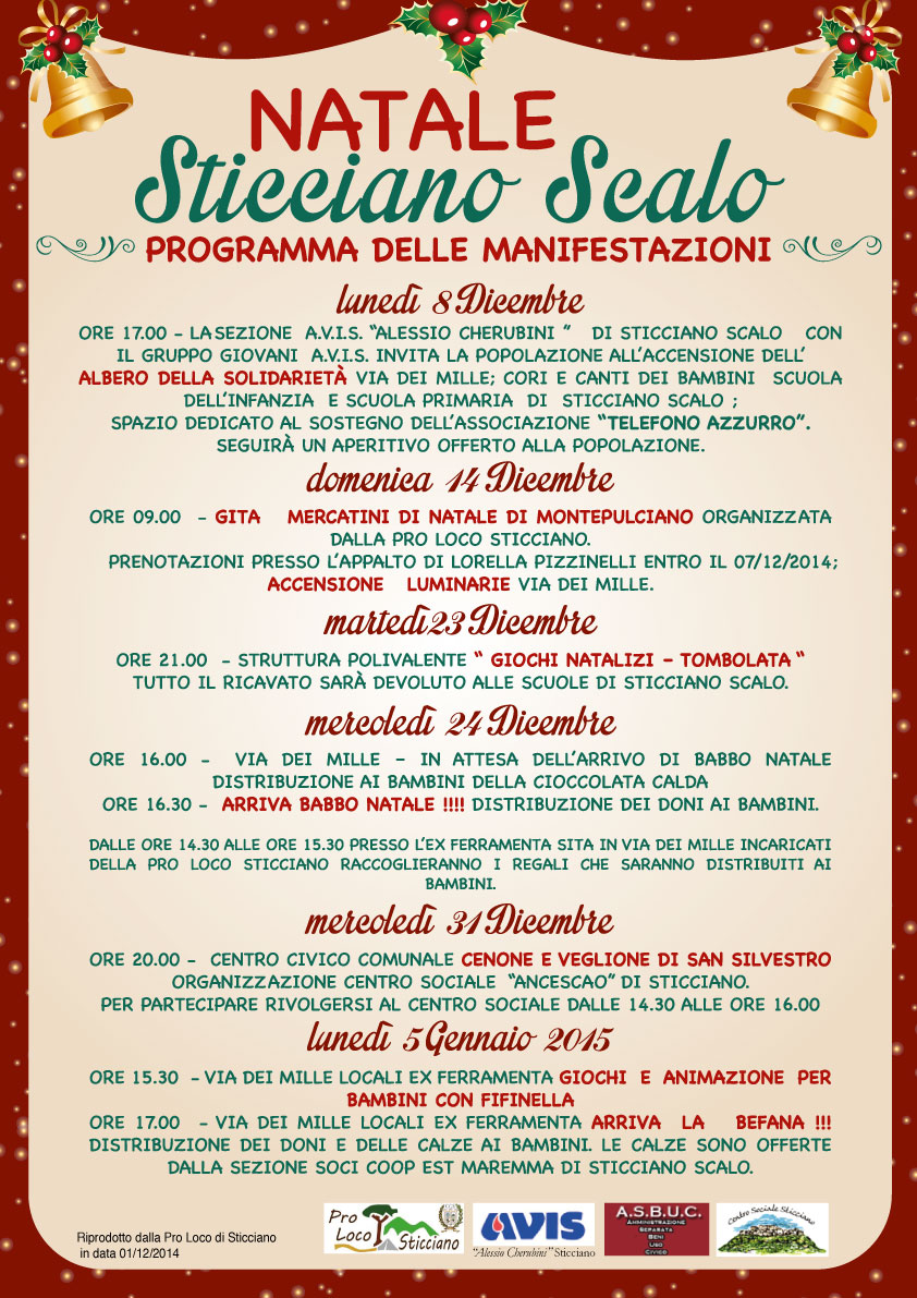 Ore 09.00 – GITA MERCATINI DI NATALE DI MONTEPULCIANO organizzata dalla Pro loco Sticciano. Prenotazioni presso l’APPALTO di Lorella Pizzinelli entro il 07/12/2014.